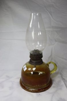 with ruby quilted shade and brass stem on bast iron bronzed base featuring a chirub