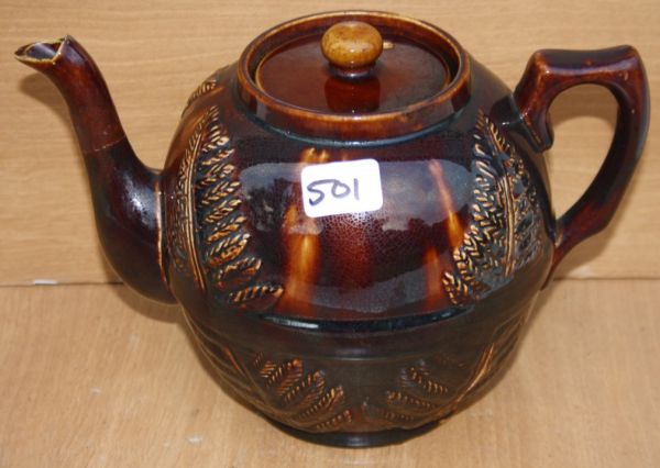 Fern pattern, brown glazed. Repair to spout and chip repaired on top lip.