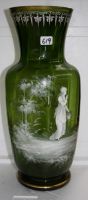 Green glass with fancy enamelled lip. Woman picking flowers and bunch of flowers on reverse. 480 mm, rare size