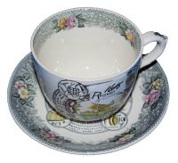 21 cms tall. With ice catcher. Brown glaze. 'Oldest and Best'. One reverse is a floral pattern of snow drops. Spotting on glaze Handle broken but all there to put back together. Rare