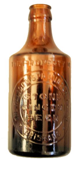 Dump amber glass, pyro label. Large print. Brewed Stone Ginger Beer. VGC