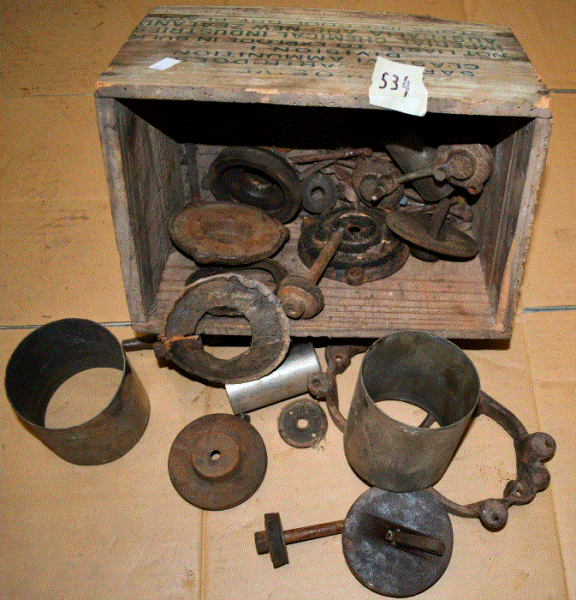 12 original Wakefield Castrol bottles. Mostly renovated tops. Original enamel sign with dings to holes and a crease top right corner.