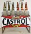6 bottles. All original Castrol bottles with renovated tops. Original enamel sign- some dings around edges and screw holes
