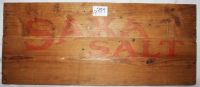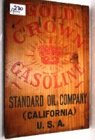 Embossed, black on orange.  5'11"x1'11"  Restored to good condition  - has ben painted all over.  Some flattening to rolled edge
