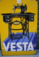Black, blue, white on yellow.  Vesta Vesta Sewing Machines.  Picture of  sewing machine. Rolled edge.  Few dings around edges, 95%  1'8"x2'6"