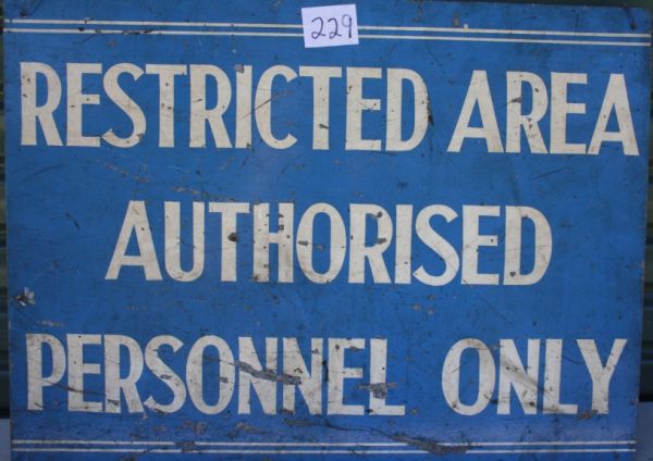 Painted.  White on blue.  Restricted Area.  Scuffed and scratched all over, 80%. 2'x1'6"