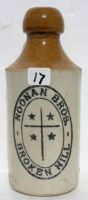 Two tone, DBT. Noonan Bros., Broken Hill. Four stars and cross tm. Pinnacle Brand . Light glaze flaking inside lip, Few scattered marks to back. GC
