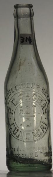 7-10 oz.. Light amethyst glass.  R.G Thomas, Gundagai.  Stone Ginger Beer.  Initials tm.  Minor ding to lip. Small internal bruise to reverse. Scuffed and scratched.  GC
