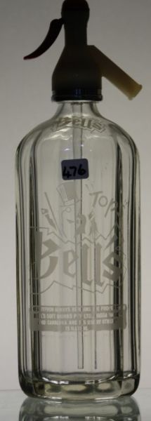 Fluted.  Bell's Tops, Wagga Wagga.  Figure with top hat tm.  Few minor marks.  Also branded Bell's on top of shoulder.  plastic top,  VGC
