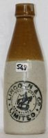 Both two tone ChS.  Wilson Brewed Ginger Beer.  Initials in shield tm.  U.F.Wilson, Albury, on reverse.  Stained and haircrack to side. Other C.R.Goulding, Geo. Hynes Proprietors, 94 & 96 High St., Prahran.  Chip to shoulder, glaze flaking to back lip, pitted and stained.  Both FC