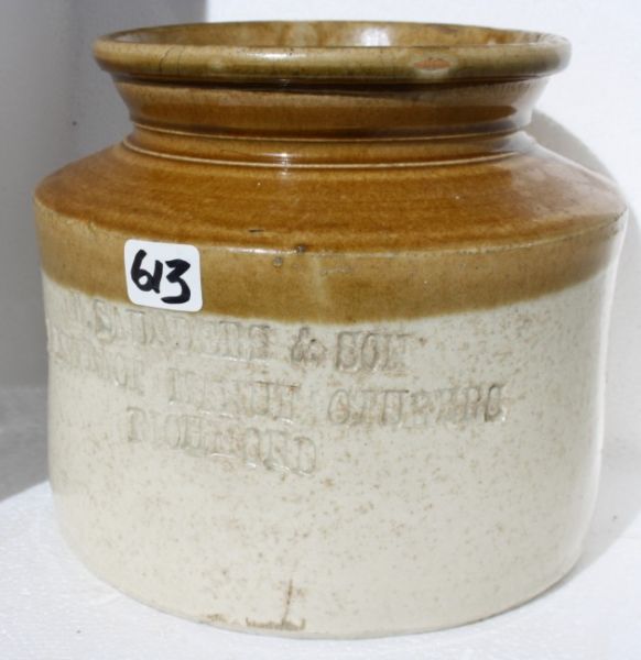 Two tone, 13cm, impressed, W Saunders & Son, Malt Extract, Manufacturers, Richmond.  Spotty glaze with couple scratches to base, minor hairline cracks around lip, GC