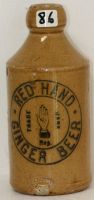 All tan DBT.,  Red Hand Ginger Beer.  Hand tm.  Glaze kiss to side shoulder, rust marks.  Small patch of missed glaze to front base.  Minor glaze wear around lip.  GC