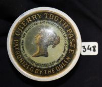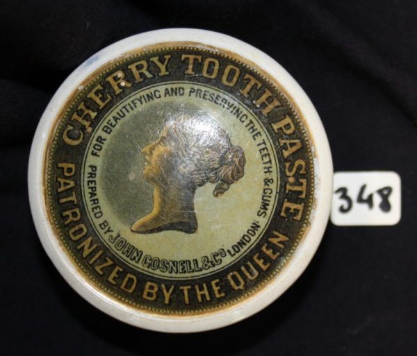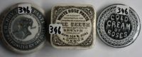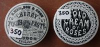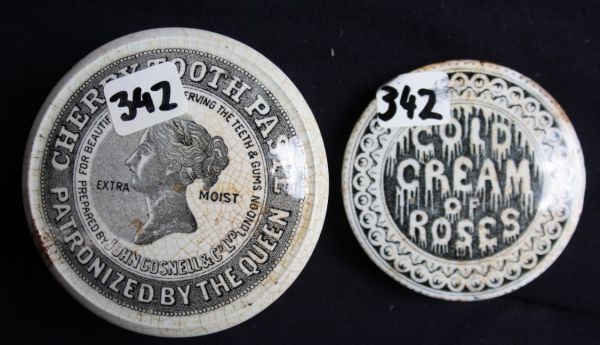 John Gosnell Cherry Toothpaste.  Queen's head tm.  Crazed, with tip staining.  Minor glaze flaking around edge.  FC. Other Cold Cream of Roses.  Crazed and tip stained with minor chip to flange, glaze wear around edge.  FC
