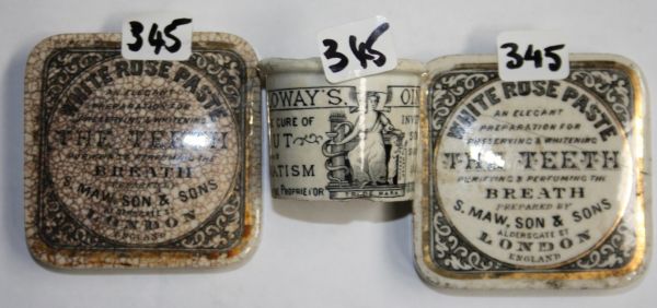 Both black and white, with bases.  S. Maw, Son and Sons, crazed, broken in half but good.  Other Cold Cream of Roses.  VGC.  Both have minor marks