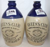 Two Whisky Decanters Blue Top, Queens Club Scotch Whisky, both have chips to side lip one has scuffs and marks
