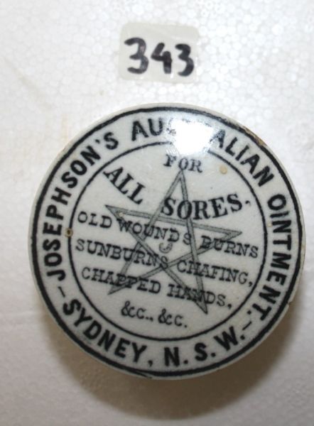 Josephson's Australian Ointment, Sydney, NSW.  Star with initial tm.  Some minor crazing and staining.  Minor glaze flaking around edge.  VGC