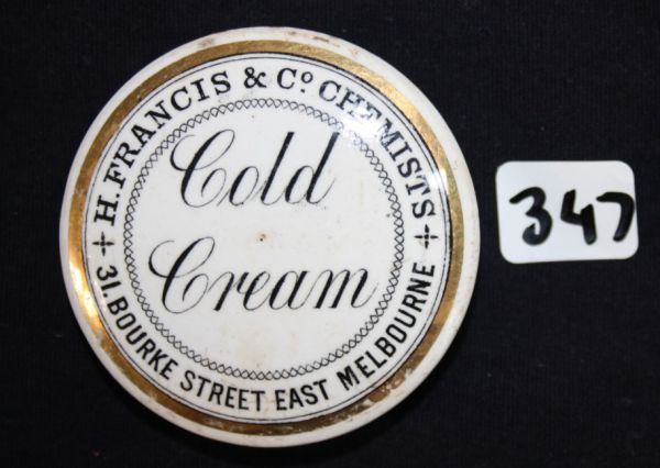 H. Francis & Co., Chemists, 31 Bourke St., East Melbourne. Has hairline running around left side of bottom flange.  Some glaze wear to edge of face.  Minor staining and wear.  GC
