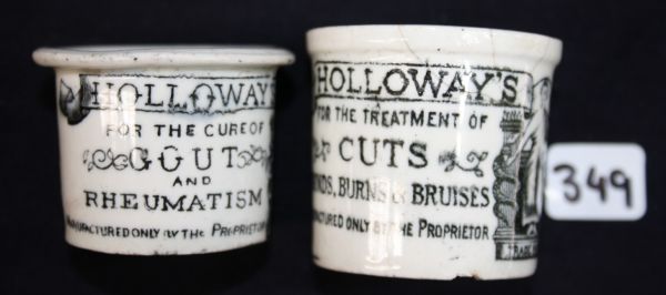 Both Holloways.  One is Southwark St., London, with hairline running from body over lip and into pot.  Other Oxford St., London, some minor glaze wear and marks.  GC