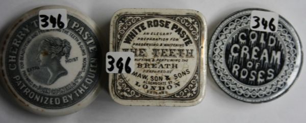 White Rose Paste, small chip to flange, crazed and stained; John Gosnell, Queen's Head tm, tip stained around flange and top edge; Cold Cream of Roses, minor staining few marks. Fc