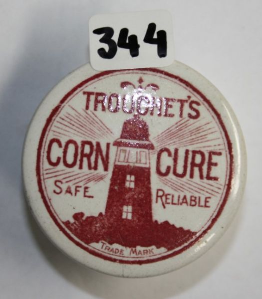 Trouchet's Corn Cure (red print).  Lighthouse tm.  Minor hairline running from face edge down side of flange.  Some minor marks.  VGC
