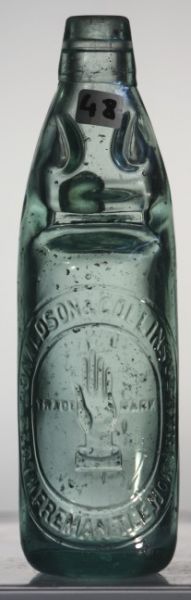 13 oz.,  four teardrops,  Donaldson & Collins, Perth, Fremantle, Northam.  Hand tm.  Some minor bruises and a burst bubble on base.  Ding to front base, scattered fisheyes and pitting.  Flakes and pitting around lip.  Polished to GC