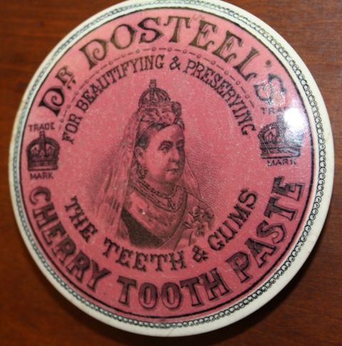 Black embossed on rose coloured background.  Dr. Dosteel's Toothpaste.  Queen Victoria featured in centre.  Bit flaking to bottom of base flange.  VGC
