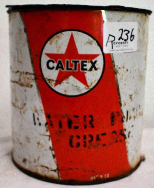 Two grease cans, Caltex 1 lb, Mobil 500 grams