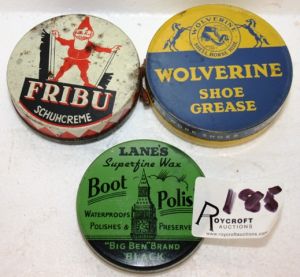 Lane's Boot Polish, clock tower tm; Fribu, gnome tm; Wolverine Shoe Grease, horse tm.