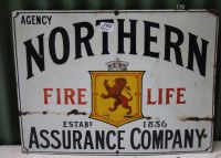 Northern Assurance Company, Fire, Life.  Pictorial of crowned shield and lion.  Multi coloured,  Creased, faded, light ding to edge.  2'x1'6".  85%.  $250