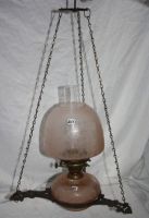 With pink etched bowl and shade, cast iron 3 arm hanger. All new