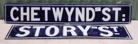 Story St; Chetwynd St.  Both white on blue, minor dinging around holes, few scratches and scuffs.  SOLD $200
