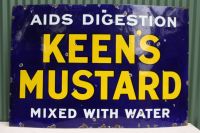 Keen's Mustard Aids Digestion, Mixed with Water. Yellow, white on blue. Scattered dings, mainly to edge, 6'x4'. 95% SOLD $500