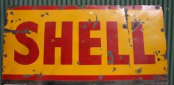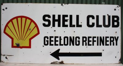 Shell Club, Geelong Refinery. Pictorial of a clam shell. Black, yellow, red on white. Scattered dinging, crease to one end and base. 6'6"x3'3" 90%. Rare sign. SOLD $550