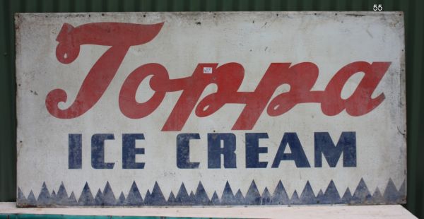 Toppa Ice Cream. Red, blue on white. Scuffed, faded and marked. 6'x3'. 75% SOLD $275