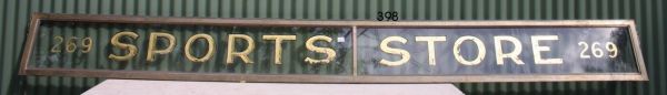 Sports Store, 269. Gold lettering. Brass bounded sign. Crack in glass, otherwise very good. 12'6"x1'3". SOLD $200