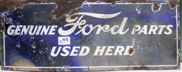 Convex sign, white on blue.  1'2"'x10". Some light chipping around edge, few scuffs and marks.  95%