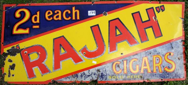 3 piece sign with centre piece (Tobacco in its finest form being painted). Black red on yellow with centre piece being white on green, 13' x 9" Dinged along edges with marks and some paint wearing of  painted centre sign.