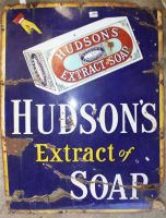 Multi coloured with pictorial of packet of soap, 2'8 x 3'6. Rusted, creased, rust holes.  Fair