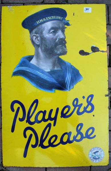Multi coloured  with pictorial of packet of cigarettes 1'6" x 3' Heavily dinged and rusted and rusted away in one corner of base. Fair