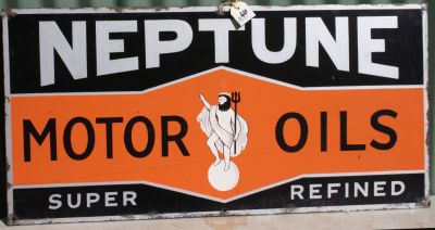 A John Nichols painting, double sided, with pictorial of Neptune and trident.  3'x1'6". Surface rust and some peeling around edge.  VGC