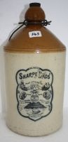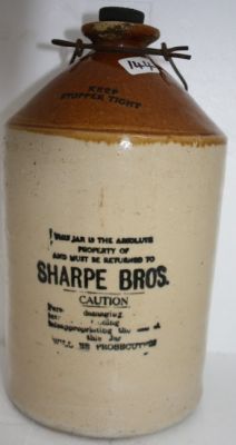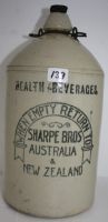 All white 1Gal, Sharpe Bros., Health Beverages, with wire handle. Fowler potter's mark high up on front shoulder and 'Caution' wording to reverse. Glaze kiss/manfacture's fault between H and B of Health Beverages on front with some minor wear and marks. GC