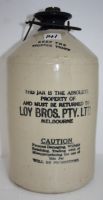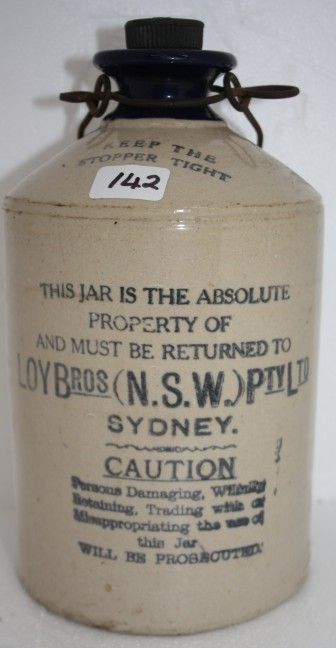 Blue tip, with wire handle 1/2Gal., Loy Bros. Pty. Ltd. Sydney. Brewed Ginger Beer to reverse shoulder. Small chip to reverse side base roll with glaze crazing and minor marks., GC