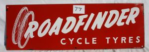 White on red.  Roadfinder Cycle Tyres. 2'x8".  Minor dings to edges. 95%