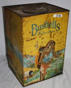 12 lbs Bushells.  The Tea of Flavor.  Features women picking tea.  Rust spotting and rust.  Fair to 80%