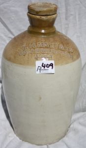 Two tone, one gallon, shaped.  T.H.Mate & Co., Wine and Spirit Merchants, Albury.  Repair to top and handle.  GC